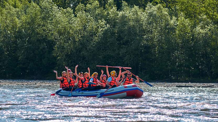 In dem Moment ein großer Schreck, aber hinterher etwas, worüber Sie und Ihr Team lachen können. Beim Rafting aus dem Schlauchboot zu fallen kann durchaus passieren. Deshalb ist es wichtig, dass Sie schwimmen können. Allerdings tragen Sie auch eine Schwimmweste und einen Neoprenanzug, weshalb Ihnen nicht viel passieren kann. Schnell werden Sie von Ihrem Team zurück ins Boot gezogen und die Tour kann weiter gehen!