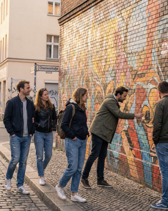 Geführte Street-Art-Tour durch Berlin mit interaktiven Aufgaben, Austausch in Kleingruppen und gemeinsamem Abschluss – Fokus auf Stadt, Kunst und Teamdynamik.