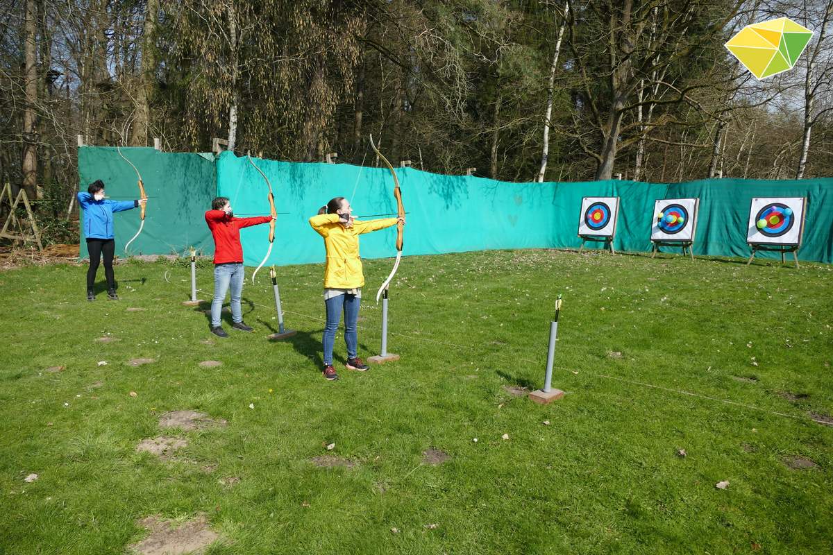 praktisch. Die Teilnehmer statten sich mit Pfeil und Bogen aus, ziehen sich die Schutzausrüstung für die Arme an und nehmen Position an der Abschusslinie ein. Mit ruhiger Hand wird der Bogen gespannt, das Ziel anvisiert und abgeschossen. Jeder Schuss ein Treffer?