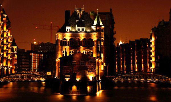 Weiter geht es in Richtung Elbe und Hafen, vorbei am Fischmarkt, wo seit über 300 Jahren Sonntags um 5 Uhr ein ganz besonderer Markt stattfindet. In der Fischauktionshalle spielen Live-Bands und es herrscht eine unbeschreibliche Stimmung. Auf der anderen Elbseite liegt die Werft Blohm & Voss, in deren riesigen Docks die Giganten der Meere, Container- und Kreuzfahrtschiffe ausgestattet oder überholt werden. Wir sehen auf Terminals, wo Tag und Nacht Schiffe be- und entladen werden. Im größten Hafen unseres Landes, dem Motor der Hamburger Wirtschaft, herrscht immer ein lebhaftes Treiben. Weiter geht es an der Elbe und den Landungsbrücken entlang, dem „Alten Elbtunnel", den Museumsschiffen zur historischen Speicherstadt, deren erhabene Backsteinkulisse dezent und stimmungsvoll angestrahlt wird.