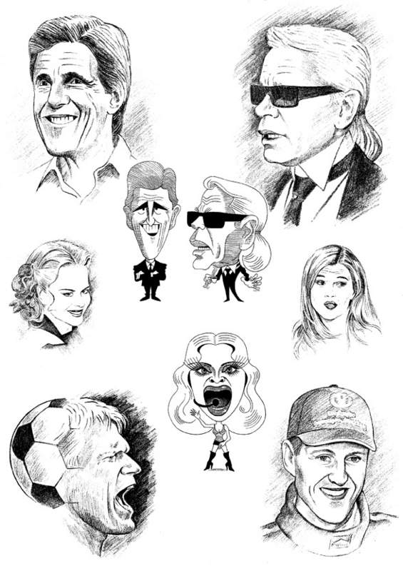 Ich biete Schnellporträts und Karikaturen bei Events und Veranstaltungen wie z.B. Tagungen, Hochzeiten, Firmenjubiläen etc. Eine weitere Spezialität sind Geschenk-Karikaturen in Schwarz-Weiß oder Farbe, als Bild gerahmt oder für Druck auf z.B. T-Shirts oder Tassen.