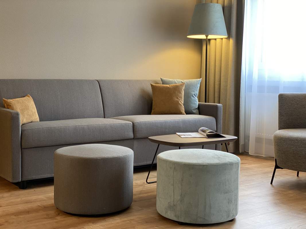 Für 1 bis 2 Personen, ca. 25 m², großzügiger Wohn-/Schlafraum mit Kabel-TV und Radio, Sitzecke, volleingerichteter Küche (Herd mit 2 Kochplatten, Kühlschrank, Toaster, Kaffeemaschine, Wasserkocher, Geschirr für 2 Personen), Bad mit Dusche/WC. Das Studio ist kombinierbar mit einer Suite.