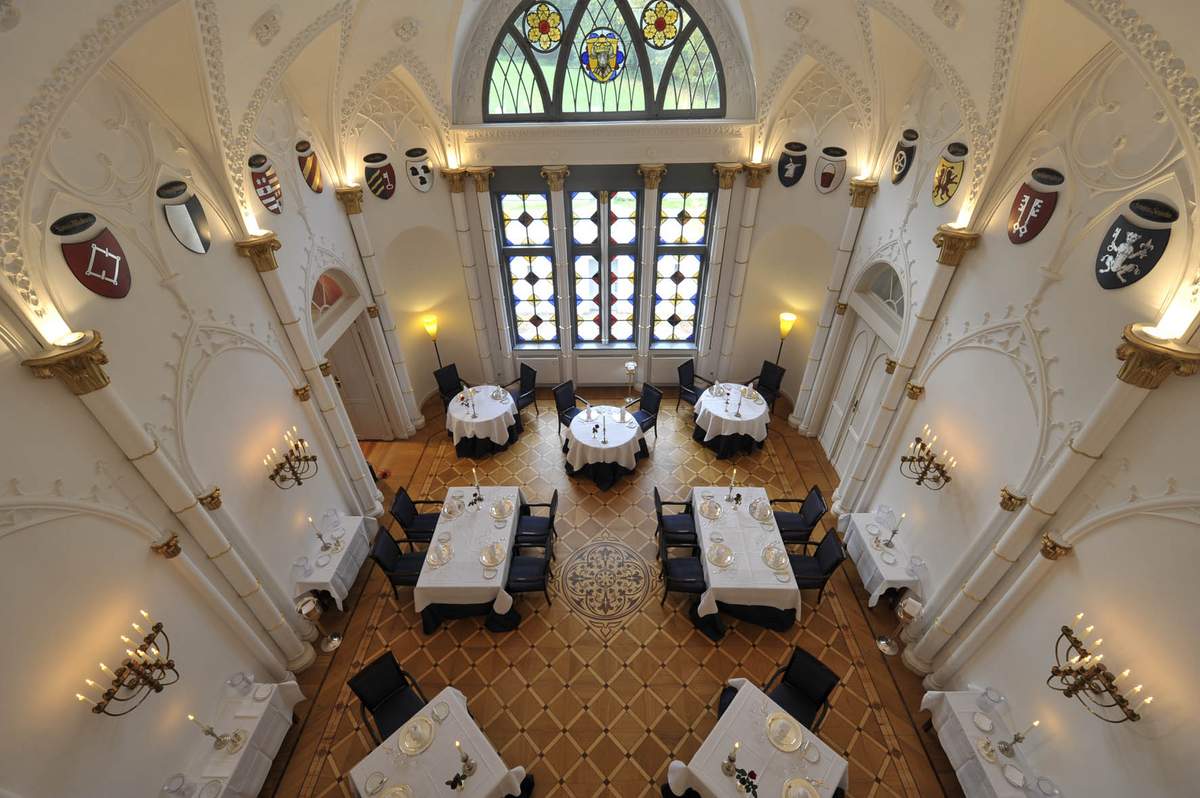 Der Stil der Küche lässt sich mit klassisch-französisch beschreiben. Küchenchefin Sabine Teubler bietet ihren Gästen neben Edelprodukten aus aller Welt auch regionale Delikatessen. Vom Wild aus der eigenen Jagd bis zu wilden Kräutern und Beeren – die Schätze aus dem Schlosspark sind zum Greifen nah. Das Gourmetrestaurant ist im neogotischen Wappensaal untergebracht. Fürs „Private Dining“ zu zweit oder im Freundeskreis werden gerne auch die angrenzenden Salons hergerichtet.