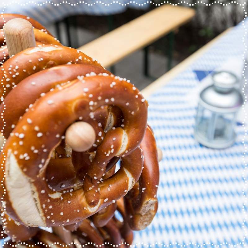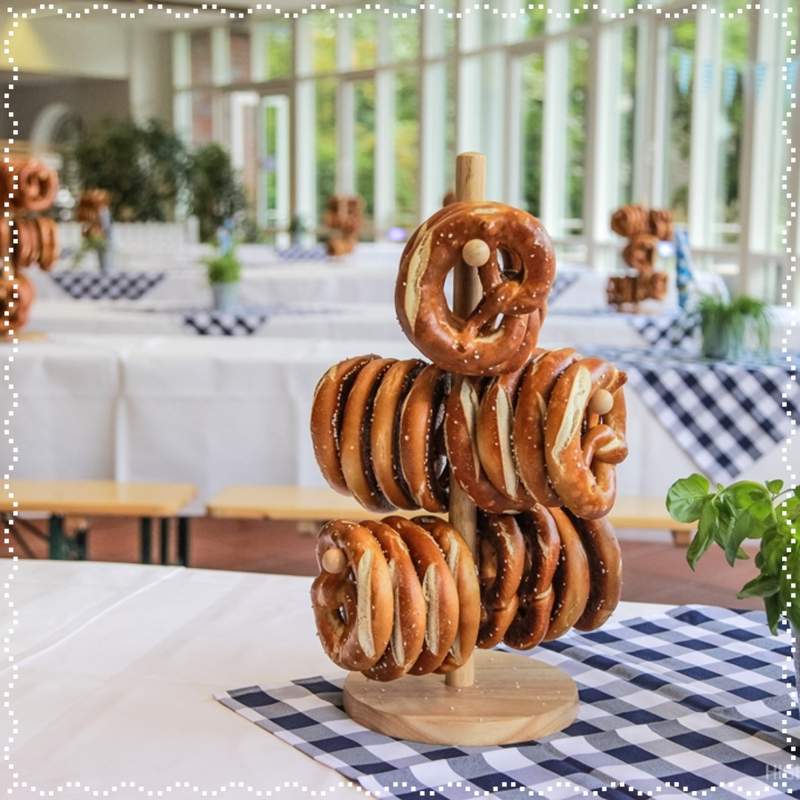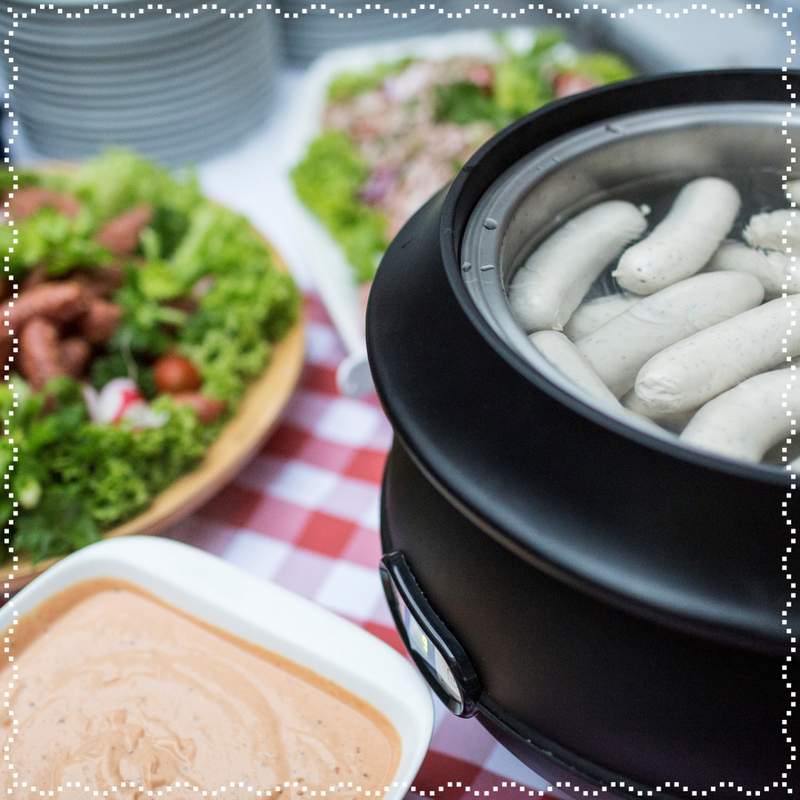 - Bayrisches Essen serviert aus unseren stylischen weiß- blauen Pagodenzeltensaftiger Schinkenbraten, Schweinshaxe, hausgemachte Semmelknödel mit Pilzrahmsauce (veg.), Weißwurst mit süßem Senf, Fleischpflanzerl, bayrischer Kartoffel- oder Wurstsalat, fränkischer Krautsalat, frisch gebackene Brezeln und Sauerteigbrot mit Butter