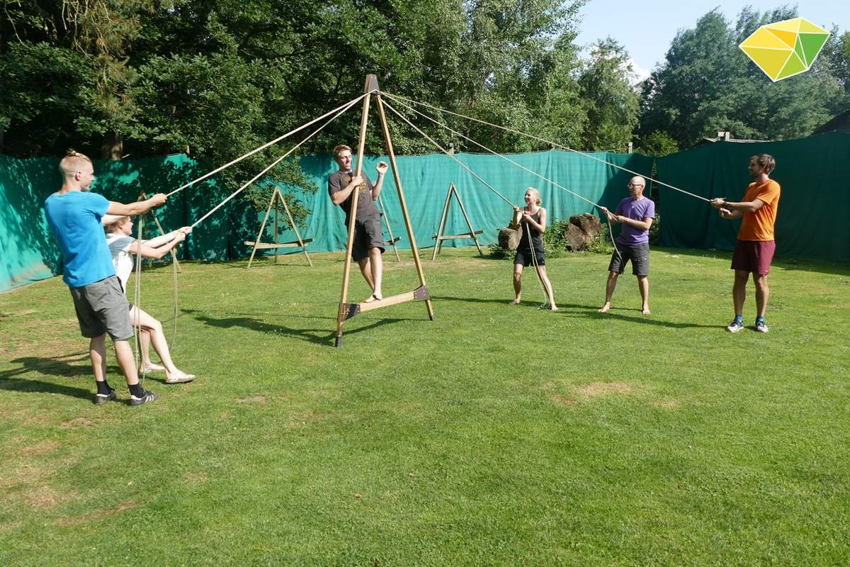 Das Team steht auf einer Plane und soll diese wenden ohne die Plane dabei zu verlassen.