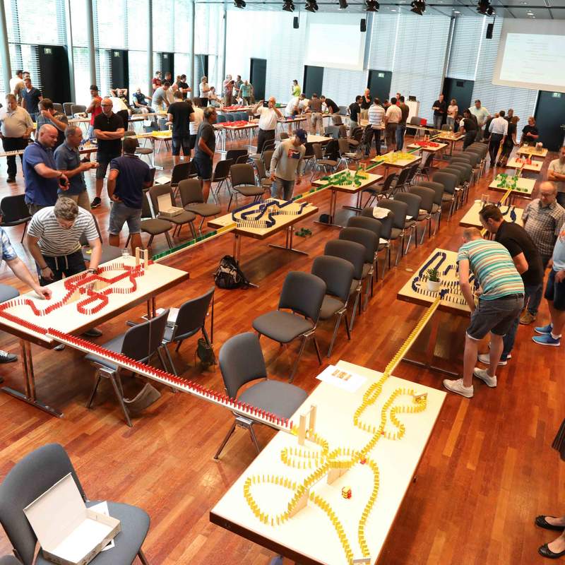 Nach der Bauzeit werden die einzelnen Dominobahnen vorgestellt, fotografiert und "scharfgemacht". Anschließend wird die XXL-Bahn angestoßen. Erleben Sie eine unglaubliche Spannung bei Ihren Teilnehmern, sobald die Steine fallen und den grenzenlosen Jubel, wenn es funktioniert hat.