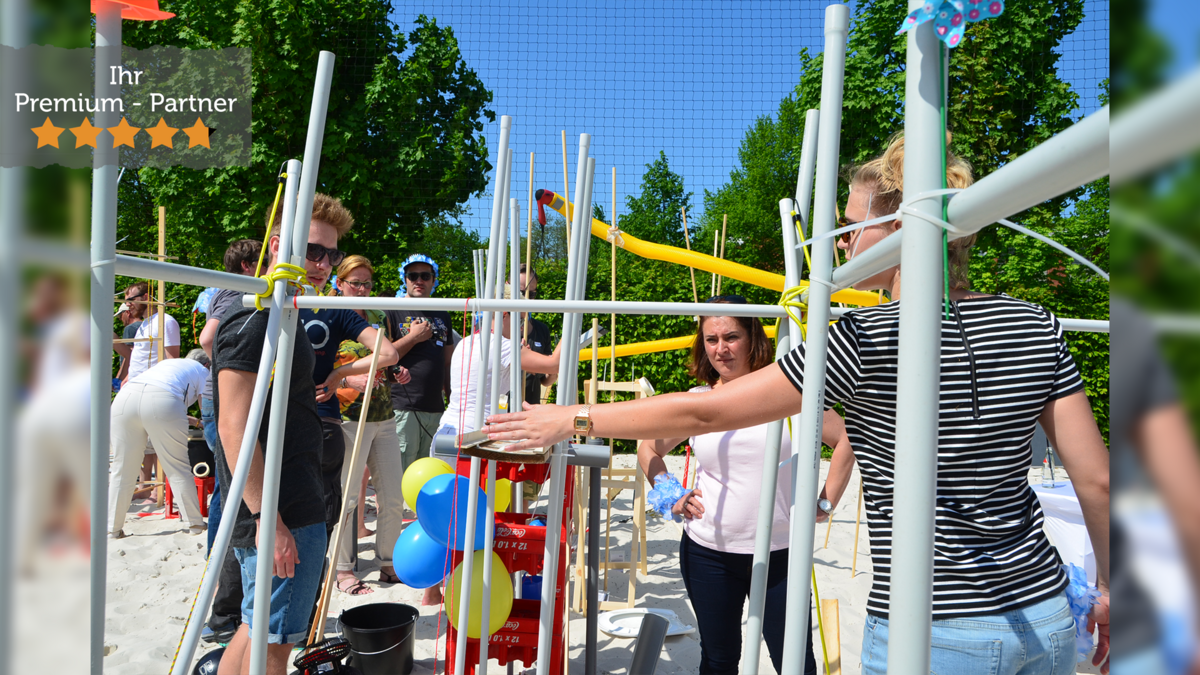 Kreativität, Absprachen, Flexibilität und Teamwork sind die Erfolgsgaranten, wenn es an den Bau der Impulskette geht. In Kleingruppen tragen die Teams zum Erfolg eines einzig großen Dominoeffekts bei. Erlaubt ist was funktioniert und so haben die Teilnehmer die Möglichkeit, aus einem riesen Angebot an Baumaterial wie Latten, Kugeln, Eimer, Kegel und vielem mehr, die aberwitzigsten Konstruktionen zu bauen, um den ankommenden Impuls an die nächste Gruppe weiterzuleiten. Das Finale bildet das gemeinsame Auslösen der Impulskette und am Ende des Durchlaufs die Auslösung eines Schlussimpulses der – je nach Wunsch – die verschiedensten Formen annehmen und gewünschte Aussagen und Botschaften transportieren kann. Ob als Hauptevent oder als Programmbaustein im Rahmen unserer Teamevents: Der Schwerpunkt der Impulskette kann – je nach Ihrer gewünschten Zielsetzung – von freudvoller Zusammenarbeit bis hin zu intensiver Auseinandersetzung mit den Arbeitsprozessen liegen.
