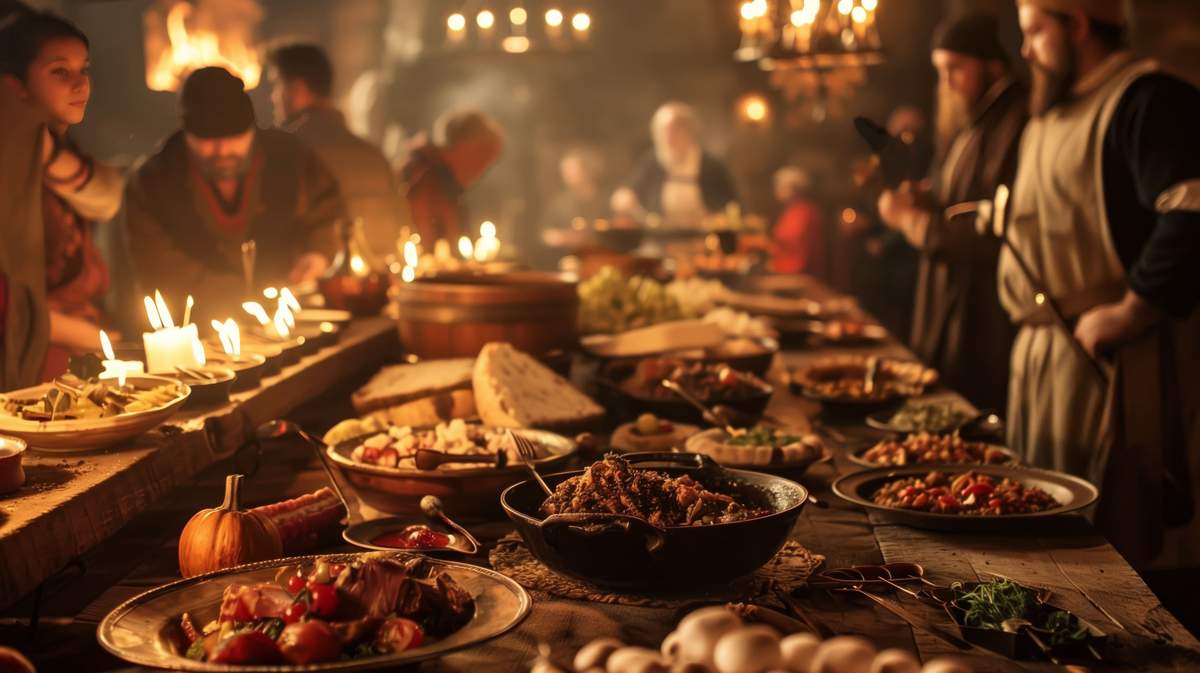 Knechte und Mägde reichen Ihnen: reichlich Obst und Gemüse der Saison, frisches Fladenbrot, eine Kräuter-Destille für den Magen, Suppe des Landgrafen, Fleisch aus des Grafen Ländereien (Schwein, Geflügel, Wild), gebratene Erdäpfel und Thüringer Klöße, warmes Gemüse aus des Klosters Garten (Rotkraut, Sauerkraut). Und zum süßen Schlusse reicht man euch einen gefüllten Eierkuchen.