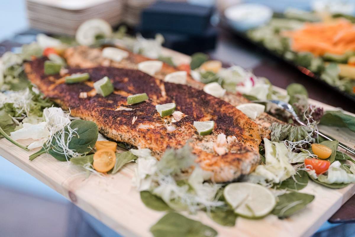 Aber auch Vegetarier und Veganer kommen mit viel frischem Grillgemüse und leckeren Grillkäse-Sorten nicht zu kurz. Ein Highlight ist sicherlic...h, wenn zum Start des BBQ der Flammlachs auf Brettern direkt an festlich gedeckten Tischen im Innenbereich serviert wird. Unbegrenzt bester Wein vom benachbarten Weingut Zaißerei und Bio-Gourmet Wasser runden das kulinarische Angebot ab.