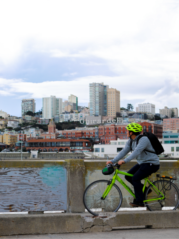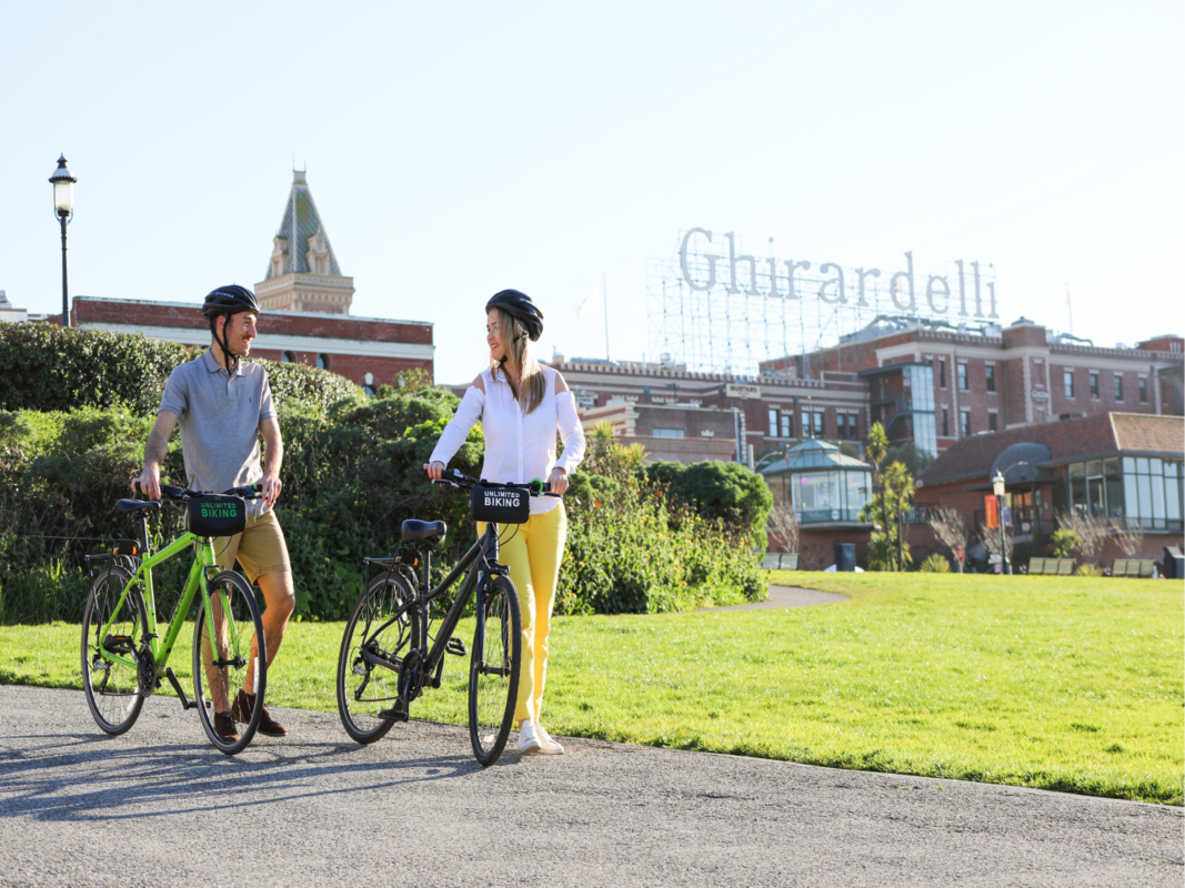 Nach der... Abfahrt vom Ghirardelli Square am westlichen Ende des Fisherman's Wharf radeln Sie entlang der grünen Hügel von Fort Mason, dem Marina District, durch Crissy Fields, hinauf und über die Golden Gate Bridge und dann die Marin Headlands hinunter nach Sausalito.