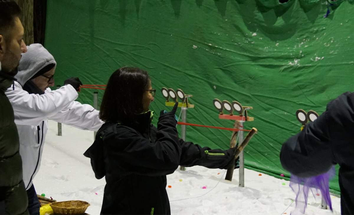 Nachdem die Teilnehmer begrüßt wurden, wird die Gruppe in kleinere Teams eingeteilt. Hierbei sind alle Teams gleichzeitig aktiv. Nach der Einweisung in den Ablauf und die einzelnen Disziplinen heißt es für die ersten Teilnehmer der Teams: Schneeschuhe anziehen und ab an den Start! Von hier wird die kurze Laufstrecke absolviert und unterwegs wartet auf die Teilnehmer das Stehendschießen mit unseren Ballschleudern sowie später dann noch das Liegendschießen mit dem Blasrohr. Nach einer möglichst schnellen Runde mit vielen Treffern geht das nächste der Teams auf den Weg, wobei die restlichen Teammitglieder ihre Läufer kräftig anfeuern. Für alle Zuschauer brennt direkt an der Strecke ein Lagerfeuer, so dass sich alle aufwärmen können und klar gibt es hier auch einen leckeren Glühwein oder Früchte-Punsch.