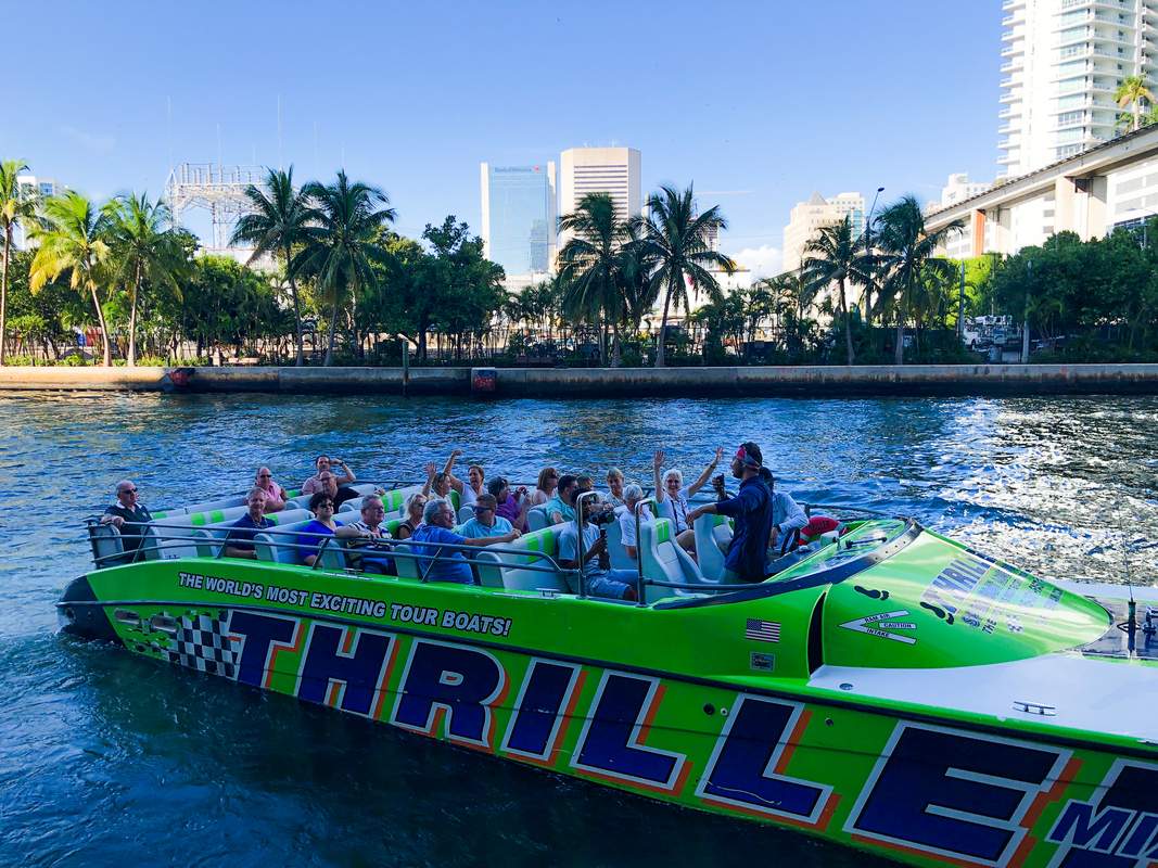 Start der City Tour ist zu Fuß vom Hotel. Der deutschsprachige Reiseleiter führt die Gruppe entlang des berühmten Ocean Drive, zur Versace Villa und durch das Art Deco Viertel. Von dort wird die Gruppe mit dem Bus zum Bayside Pier gebracht wo auf sie ihr privates Speedboat wartet. Die Speedboat Tour führt sie entlang der Star Villen von Jenifer Lopez und Will Smith und endet mit einer rasanten Fahrt auf dem Atlantik. Das Ziel ist dabei nass zu werden (bei den warmen Temperaturen in Miami sehr angenehm). Das Speedboat endet die Tour in Downtown Miami, wo es entlang der Kanäle zwischen den Hochhäusern geht. Die Gäste gehen hier zum Mittag in einem amerikanischen Burger Restaurant – direkt am Wasser gelegen. Nach dem Essen geht es zurück ins Hotel zum relaxen am South Beach.