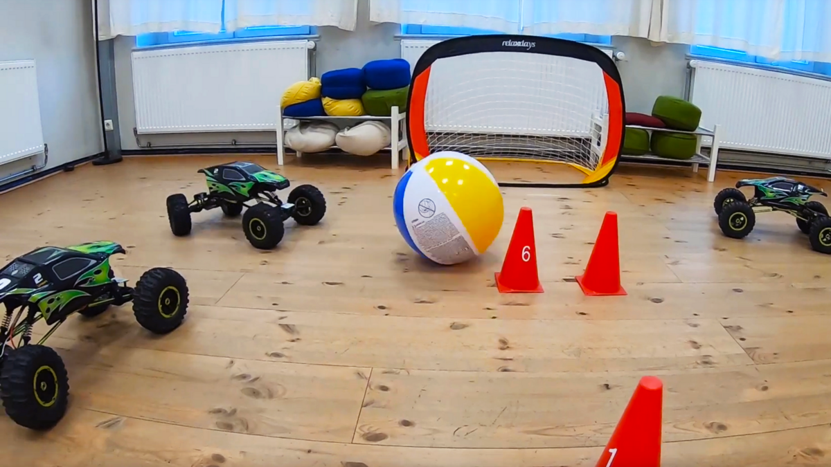Denn die Teams müssen die von der Moderation aufgestellten Parcours analysieren, den geschicktesten Weg finden und die Fahrt, wie auch den Weg des Balles, clever planen. So gibt es auch Aufgaben, in denen nur mehrere Fahrzeuge in einer gemeinsamen Koordination den Ball ins Tor bringen können. Miteinander reden, dann denken, dann noch einmal miteinander reden und dann? Gemeinsam zum Ziel kommen – das ist das erfolgreiche Konzept!