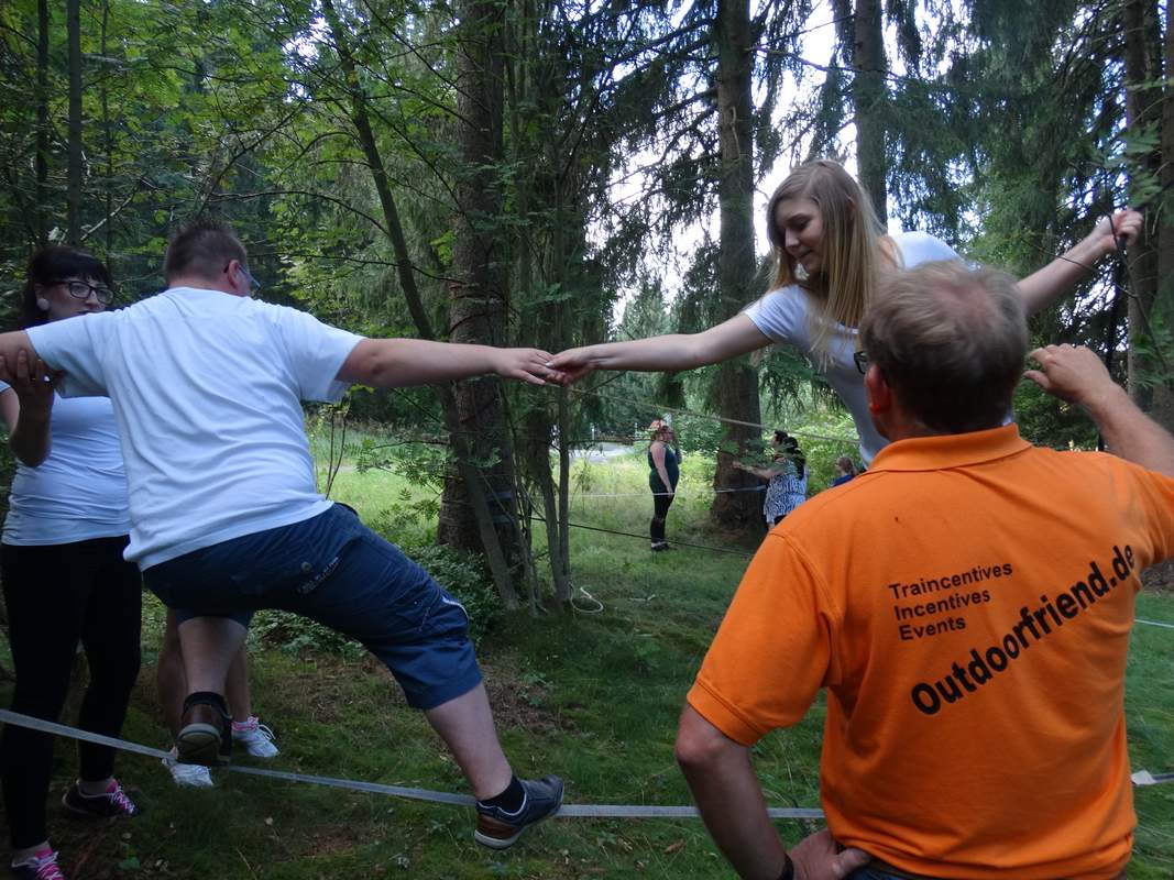 Gemeinsam als Team gilt es den Niedrigseil-Parcours zu meistern. Im Anschluss werden mit minimalem Materialeinsatz Flösse gebaut, die dann auf dem Schmelzteich getestet werden. Der Abschluss ist die Fahrt mit unserer Flying Fox - Seilbahn über den Schmelzteich.