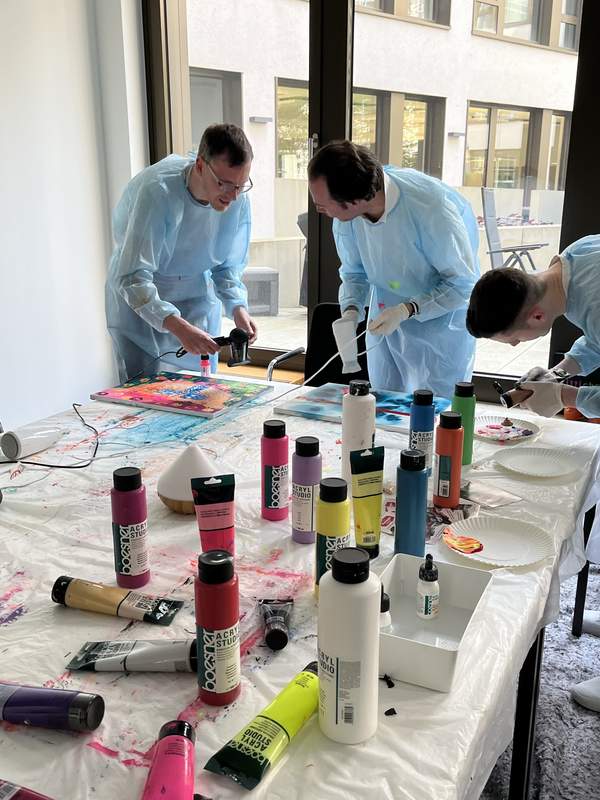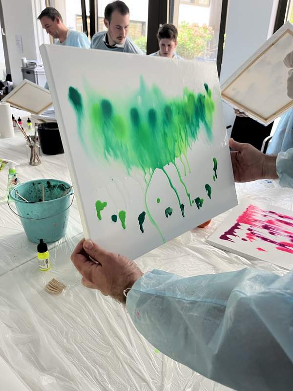 In einem Vorbereitungsgespräch besprechen wir die Ziele des Workshops, den Ablauf und eventuelle Erweiterungen. Gerne gehen wir auf Unternehmens- oder Team-Ziele ein. Was passiert im Workshop? Kreativität ist eine der wichtigsten Ressourcen des Menschen. Wie können wir unsere eigene Kreativität fördern? Und was steckt überhaupt in mir? Ablauf: Los geht es mit Auflockerungsübungen und einer Malübung, die die Teilnehmer in kreative Stimmung bringt. Das besondere an diesem Workshop ist das freie Malen. Es gibt kein vorgegebenes Bild das gemalt werden soll. So entfällt der Erfolgsdruck und die Teilnehmer können sich fallen lassen und frei mit der Farbe experimentieren. Doch wie geht man mit so viel Freiheit um? Spannende Erkenntnisse erwarten euch in diesem Workshop: Denn mit kleinen Aufgaben bringen wir die Teilnehmer in unvorhergesehene Situationen. Wie werden sie diese kreativ lösen? Alles erlebte besprechen wir am Ende in einer Reflexions-Runde. Neue Erkenntnisse zur Zusammenarbeit, Respekt und über die eigene Kreativität werden geteilt. Dieser Austausch ist jedes Mal sehr besonders. Nach dem Workshop senden wir auf Wunsch unsere Beobachtungen zu, womit hatte das Team Probleme? Was war herausfordernd? Was waren die Learnings der Teilnehmer*innen. Diese sind nicht personenbezogen. Je nach Setting, Dauer und Wunsch kann unser Workshop als Hauptevent oder als Programmbaustein in Teamevents und -trainings durchgeführt werden. Ebenfalls bieten wir Erweiterungen wie Yoga, Entspannungsübungen, Tai-Chi und Weiteres an. Dieser Workshop fördert: Teambuilding Kollaboration Selbstverständnis & Teamverständnis Konfliktmanagement Lösungskompetenz Offenheit für Veränderung Entscheidungsfähigkeit Gegenseitige Wertschätzung Achtsamkeit Intuition
