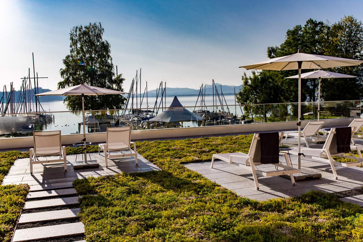 Ein absolutes Highlight ist zudem die Turmsuite mit einem exklusiven 360° Panorama Blick. Übrigens: Im Yachthotel gibt es die erste Ladestation für E-Autos am Chiemsee und das Hotel hat eine Indoor Golfanlage auf der weltweit Golfplätze bespielt werden können.