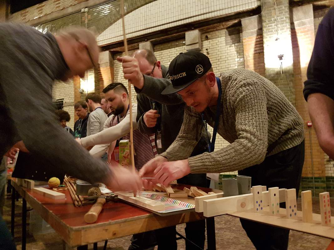 Hat die Kugel sich erfolgreich den Weg durch das Labyrinth aus Rohren gebahnt und steuert sie wie geplant auf eine Wippe zu? Voller Spannung beobachten alle Teilnehmer den Teilabschnitt, den Ihre Gruppe geplant, gebaut und gestaltet hat. Werden die einzelnen Rädchen ineinander greifen und wird die Kugel, wie vorgesehen, die Konfettikanone zum großen Finale zünden? Genaue Planung, Kreativität und Kommunikation sind die wichtigsten Bestandteile unseres Teamevents, bei dem die einzelnen Gruppen verschiedene Abschnitte einer gigantischen Reaktionskette planen, die später ineinander greifen.