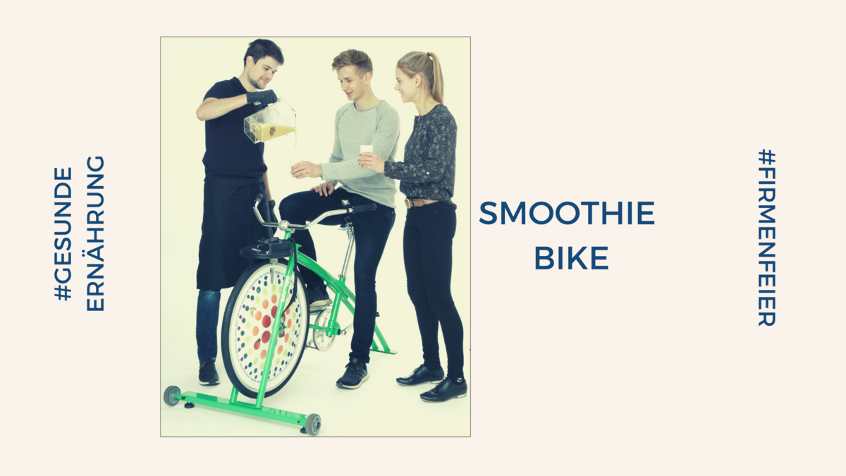 Mit dem Smoothie Bike mixen sich die Mitarbeitenden ihre gesunden Drinks selbst und erhalten gleichzeitig wichtige Ernährungstipps von unseren Experten. Wir erstellen und verteilen auf Wunsch hochwertige Rezeptkarten von den besten Smoothies. Dadurch entsteht eine Kombination aus Fitness, Gesundheit, Ernährung und gesunder Belohnung. Ein perfektes Modul zur Ergänzung ernährungsbez...ogener Gesundheitstage oder als Firmenfeier-Event.