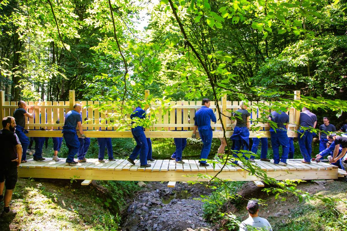 Die Handwerker:innen stehen natürlich bei jedem Arbeitsschritt mit Rat und Tat zur Seite. Während den Bau-Pausen darf im Base-Camp mit Sternenzelt, gemütlichen Sitzgelegenheiten, Verpflegung und Musik entspannt und geratscht werden. Nach Fertigstellung der Holzbrücke erfolgt die Firmengravur und feierliche Übergabe an eine Gemeinde, Verein oder anderen wohltätige Einrichtung.