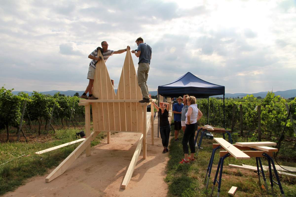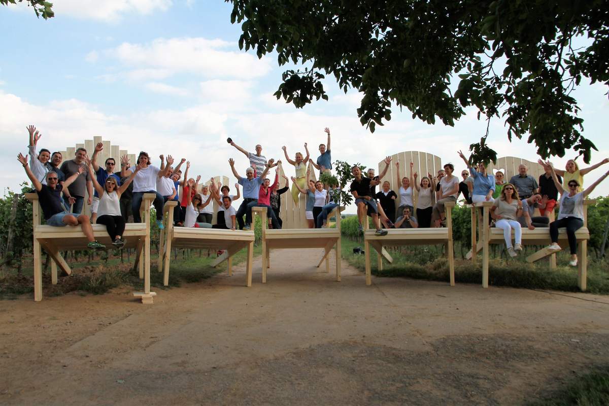 Team-Building Aktivität in der Natur mit Spaß bei dem gemeinsamen Bau eines XXL-Aussichtstuhls