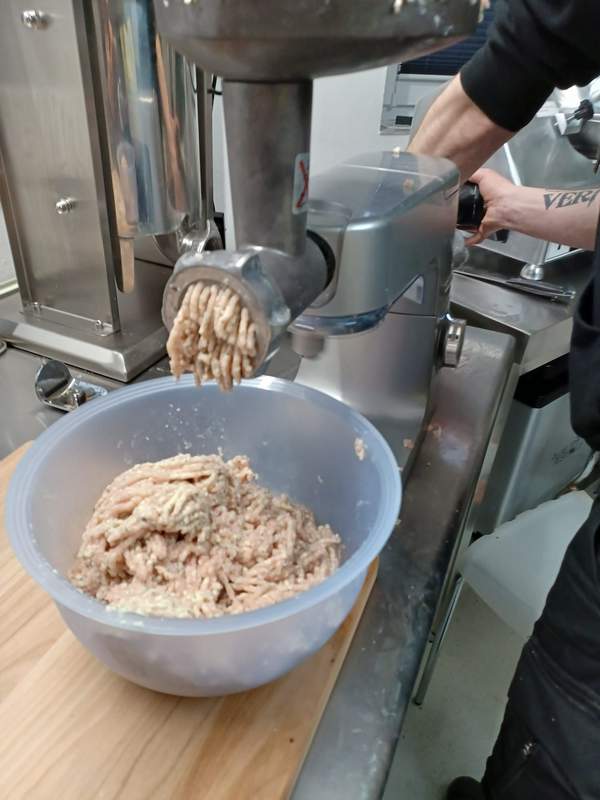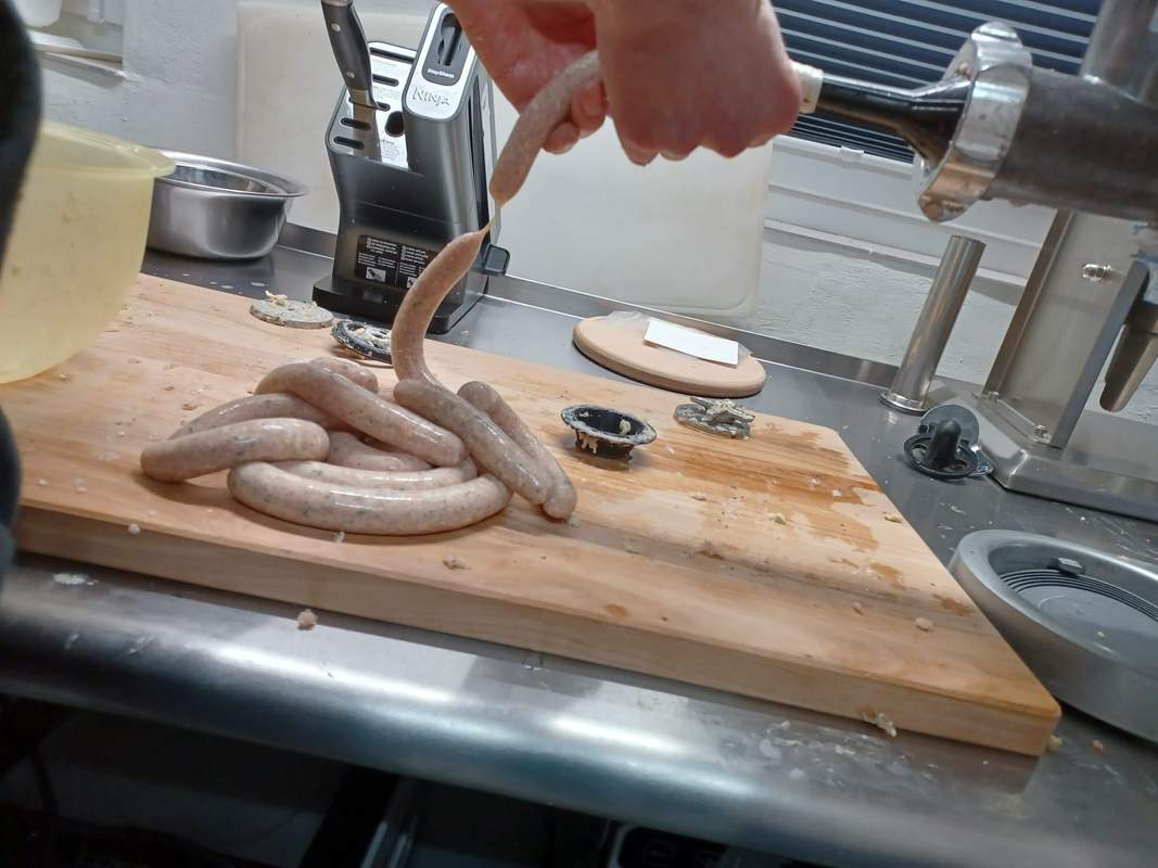 Sobald das Brät vorbereitet ist, wird es spannend: Ihr fädelt den Darm auf die Tülle und füllt eure eigene Wurst. Das Highlight? Die Kreationen werden beim gemeinsamen Grillen und Backen nicht nur genossen, sondern auch im „blinden“ Wettbewerb bewertet – möge die beste Wurst gewinnen!