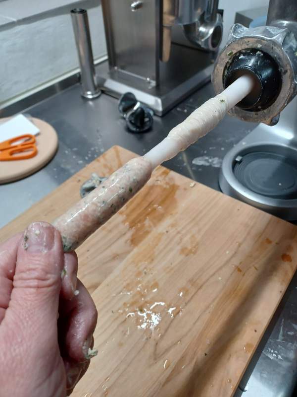 Ist das Brät vorbereitet gilt es den Darm auf die Tülle zu fädeln, ohne dass er reist. Anschließend wird die Wurst gefüllt.