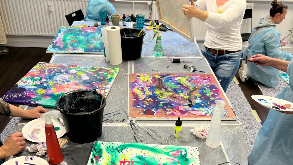 Der Workshop besteht aus Malübungen und komplett freiem, intuitiven malen. Du kannst einfach drauf los malen. Das komplette Material ist vorhanden. Eine große Farbauswahl und unterschiedliche Pinsel und Malutensilien, sodass du ganz viel ausprobieren kannst.