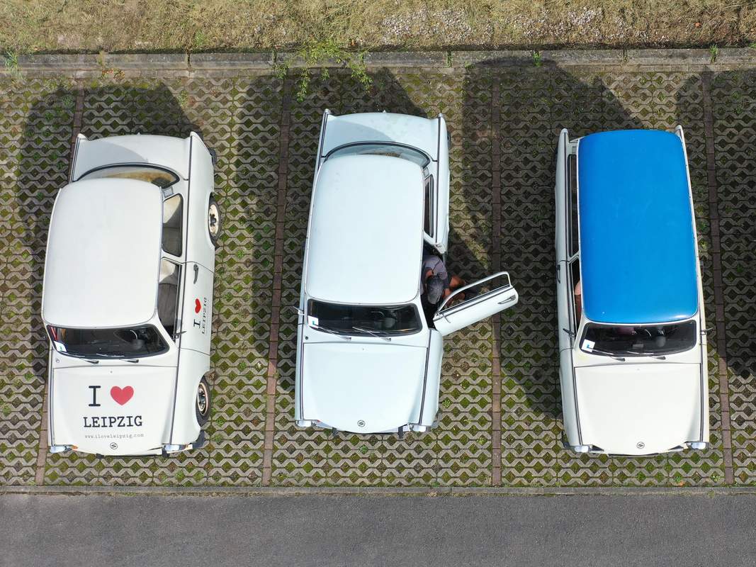 Mit unseren Oldtimer-Trabis geht es in lockeren Kolonnen auf Stadtrundfahrt durch Leipzig. Einsteigen, Benzinhahn aufdrehen, Gangschaltung suchen, Kupplung sachte kommen lassen und losknattern!