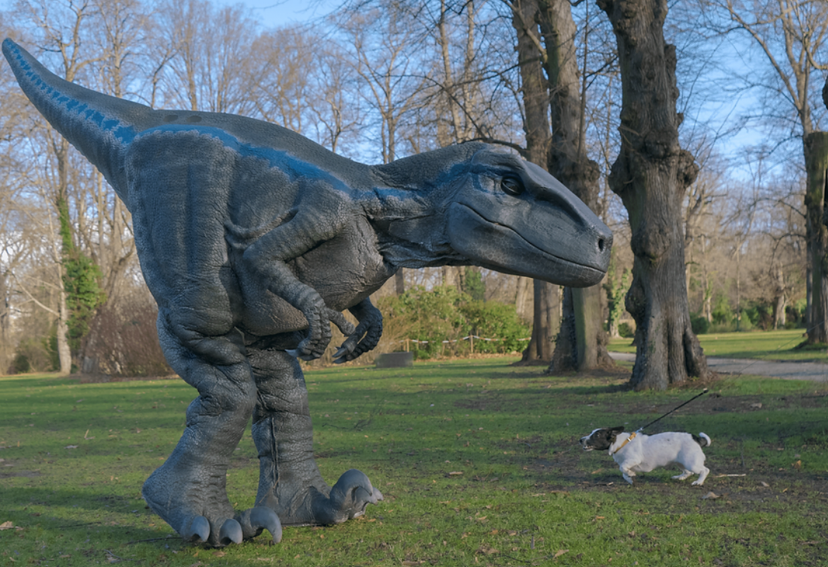Raptor Charlie (Braun) : Der 4m lange und 2,20m große Velociraptor hat mit seinem realistischen Aussehen schon den ein oder anderen Menschen in Angst und Schrecken versetzt.