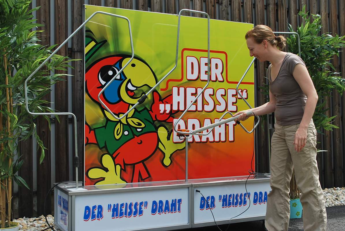 - Heißer DrahtMeistere die Herausforderung, den Ring sicher durchzuführen, ohne den Draht zu berühren - denn Alarmgefahr droht bei jeder unachtsamen Bewegung.
