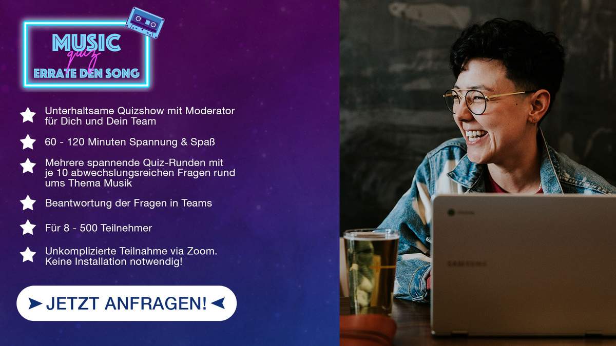 Die Teilnehmer spielen in Gruppen und werden von einem geschulten Moderator durch die Veranstaltung begleitet. Innerhalb der Spielzeit von 30 bis 120 Minuten (in der Regel 90 Minuten) ist nicht nur für viel Spaß gesorgt, die Teilnehmer kommen auch leicht miteinander ins Gespräch und stärken so das Wir-Gefühl in der Gruppe. Alle Teilnehmer schalten sich bequem vom Homeoffice aus über eine Videoschaltung per Handy, Tablet, Laptop oder Computer zum Event zu. Über einen Zugangslink kann jeder Teilnehmer ohne Installation eines Programms über einen beliebigen Browser teilnehmen und das Event miterleben. Sind Sie bereit, Ihr Musikwissen auf die Probe zu stellen und ein unterhaltsames Event mit viel Spaß im Team zu erleben? Dann buchen Sie jetzt Ihr persönliches Musik-Quiz! Geeignet für Gruppen zwischen 8 und 500 Personen. ÜBRIGENS: Das Musik-Quiz gibt es auch als Offline-Event!