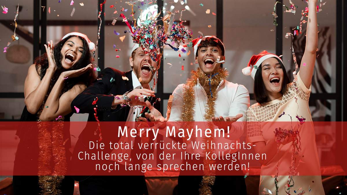 Egal ob es um fremde Weihnachtsbräuche geht oder improvisierte Sketche aufgeführt werden: "Merry Mayhem" verspricht Gelächter, Zusammenhalt und eine gesunde Portion freundlichen Wettbewerbs: Am Ende der Veranstaltung wird das Team mit den meisten Punkten zum Meister der weihnachtlichen Heiterkeit gekrönt und darf sich ein Jahr lang – bis zur nächsten Weihnachtsfeier – mit diesem Titel schmücken.