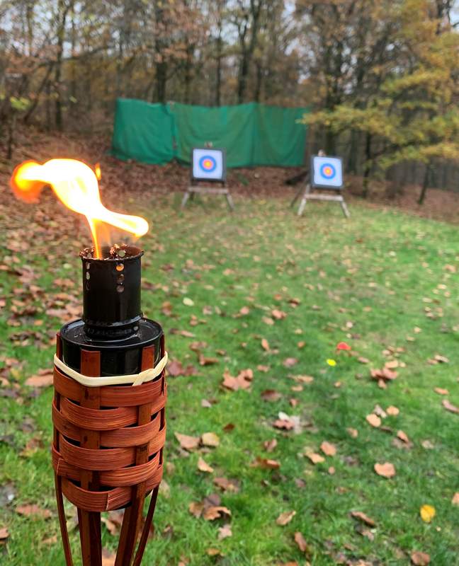 Anfängerkurs - verschiedene Ziele werden bei Fackelschein und Lagerfeuer beschossen.