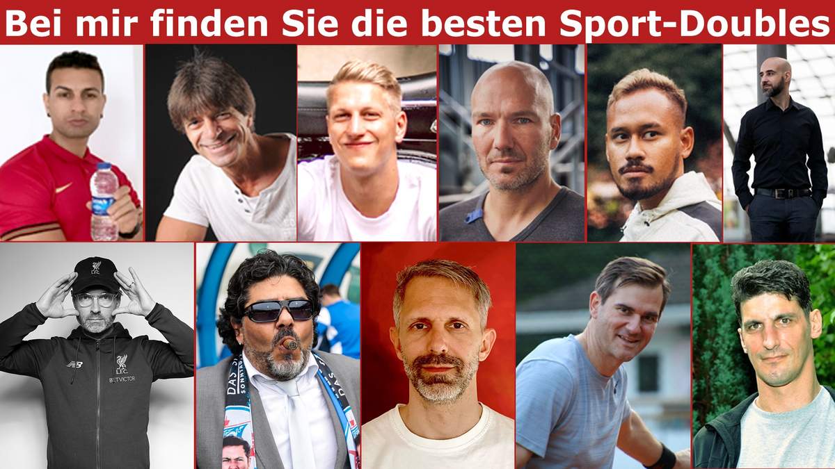 Ich vermittle die besten Doubles Deutschlands rund um das Thema Sport- und Fußball, von denen ich die meisten exklusiv vertrete und manage. Zusätzlich vermittle ich auch andere deutsche und internationale Doubles. Kontaktieren Sie mich gerne, mit Ihrem Wunsch-Doppelgänger, -Imitator oder -Tribute.