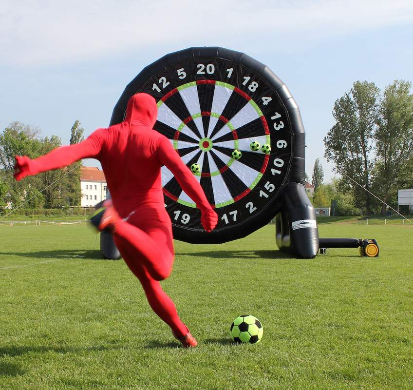 Dart und Fussball vereint auf einer großen aufblasbaren Scheibe, die mit Fussbällen beschossen wird. Mega Idee, mega Spaß!