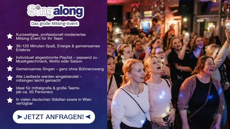 Ein charmantes Moderationsteam begleitet Sie durch die Veranstaltung und sorgt für ein mitreißendes Mitsing-Erlebnis, das nicht nur verbindet, sondern bei Ihren Kolleginnen und Kollegen auch für einen spürbaren Motivationsschub sorgt.