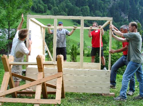 Die Bauteile werden vorab so vorbereitet, dass sie passgenau zusammengesetzt werden können. Dadurch ist eine aktive Mitarbeit für alle Teilnehmer möglich, unabhängig von handwerklicher Vorerfahrung oder körperlicher Belastbarkeit. Der Bau erfolgt mit klassischen Handwerkzeugen und unter fachlicher Betreuung durch erfahrene Guides, die den Ablauf koordinieren und bei Bedarf unterstützen.