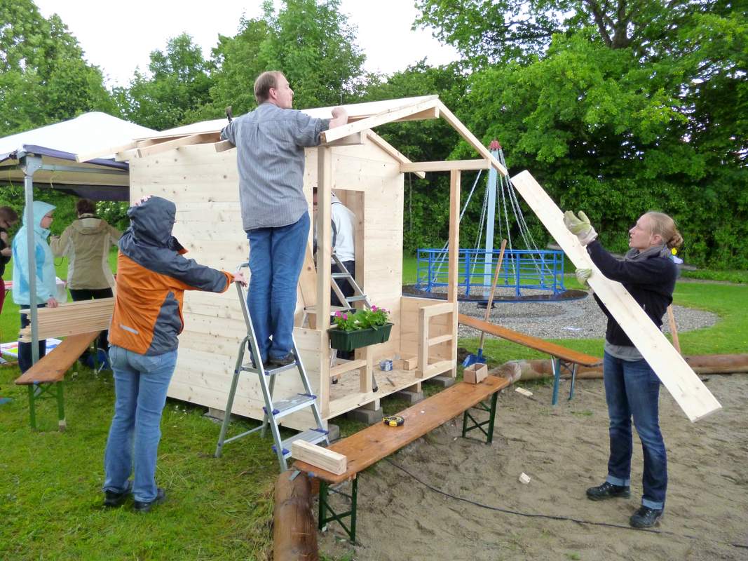 Soziales Teamevent mit gemeinsamem Bau von Spielhütten
