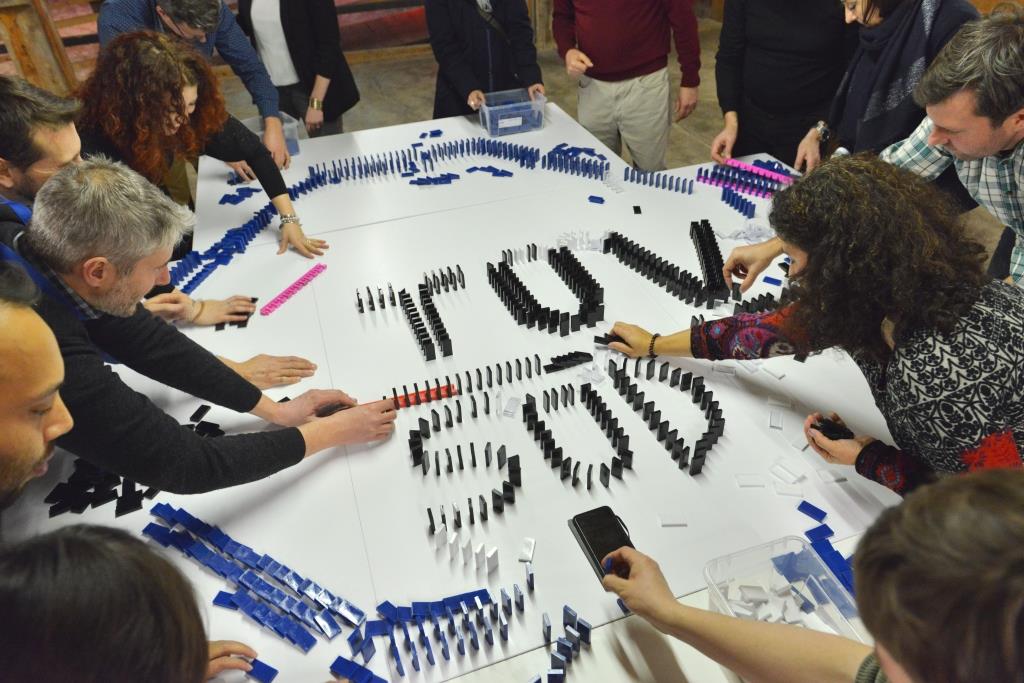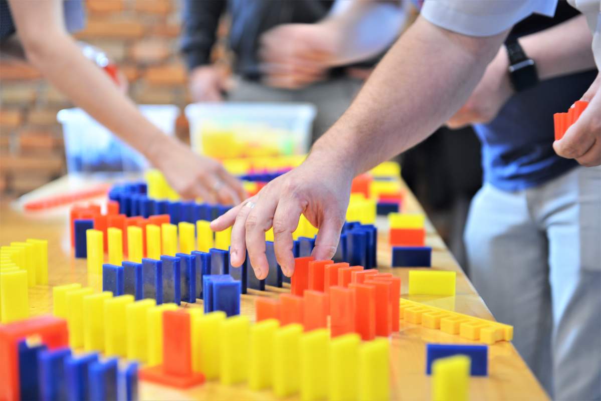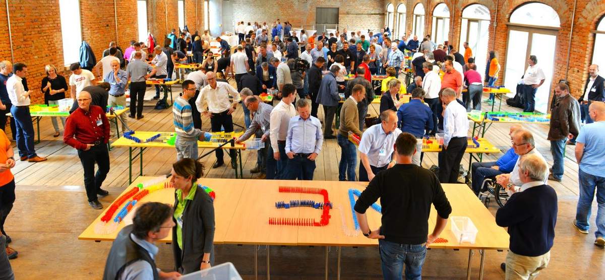 Beim Domino-Teamevent werden die Teilnehmenden in kleinere Teams aufgeteilt. Jede Gruppe gestaltet mit Dominosteinen auf eigenen Arbeitstischen ein Firmenlogo, ein Motto oder ein zentrales Unternehmensthema. Anschließend werden die einzelnen Tische durch Kugelbahnen miteinander verbunden und eine gemeinsame Mega-Kettenreaktion ausgelöst – von Team zu Team bis zum großen Domino-Finale.