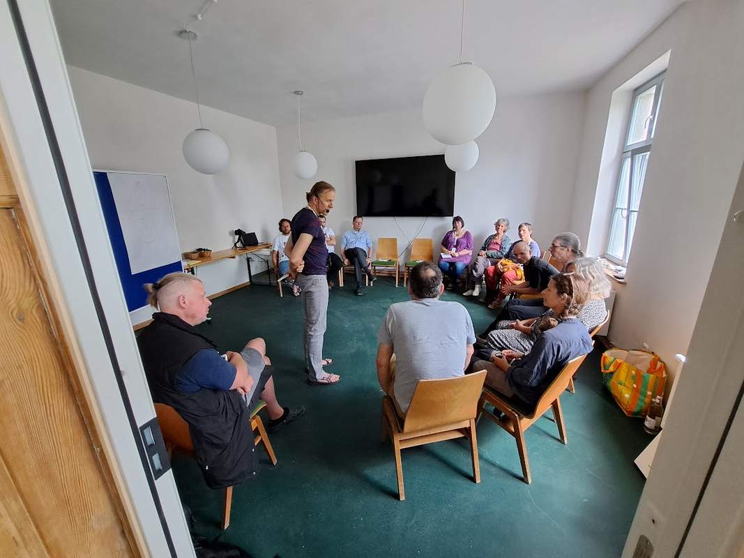 In einem Workshop werden die Erlebnisse der Teilnehmenden geteilt und mit künstlerischen Mitteln visualisiert und dokumentiert. Im Anschluss werden gemeinsam im Team die Resonanzbeziehungen untersucht zu den Schlüsselbegriffen, Prozessmustern, Einsichten, Bildern und Geschichten, die im Raum sichtbar geworden sind. Wo zeigen sich Entwicklungsperspektiven wo der Keim einer beginnenden Zukunft für die Einzelnen und für das Team?