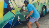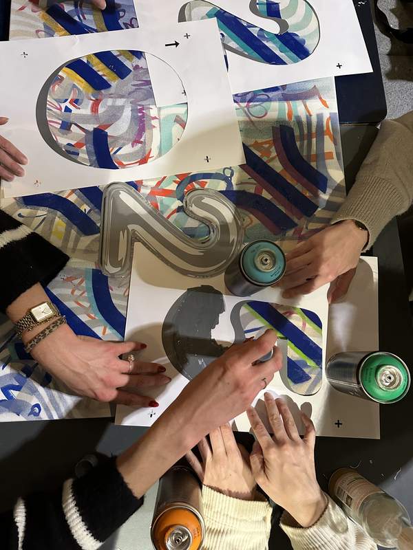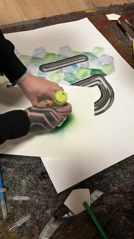 Stencils sprayen: Danach sprüht ihr die vorbereiteten Ballonbuchstaben mit Stencils auf die Leinwand. Hierbei arbeitet ihr präzise zusammen, um ein harmonisches und beeindruckendes Gesamtwerk zu schaffen, das eure Teamarbeit zeigt.