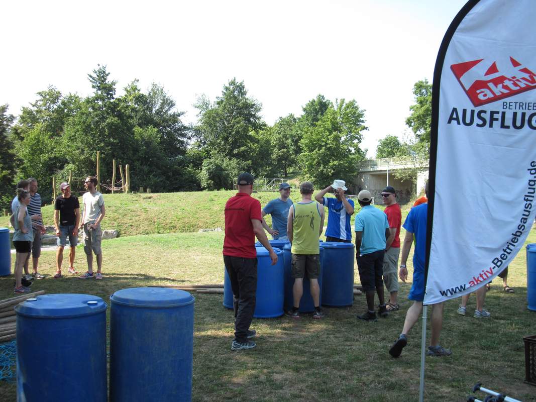 Das Material für den Floßbau liegt schon bereit. Aus Fässern, Hölzern und Seilen gilt es nun, ein schwimmfähiges Floss zu bauen. Nach ein paar Tipps von Ihrem Trainer ist nun das Team gefordert!