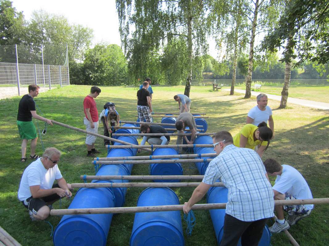 Ein kleines Teamspiel zur Einstimmung bringt die Mannschaft in Schwung. Zur Einweisung in den Floßbau gehört auch ein kleiner Knotenworkshop - hier wird etwas gelernt! Dann starten wir mit dem Floßbau und testen die Floße im Anschluss auf dem Neckar.
