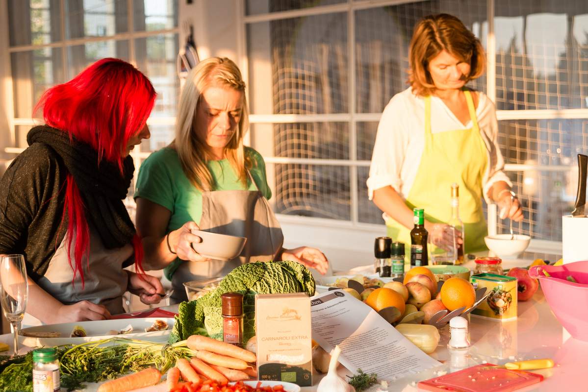 Unter professioneller Anleitung bereiten Sie alle Gerichte selbst zu. Es wird gemeinsam geschnippelt, gemixt, gebrutzelt und gelacht.