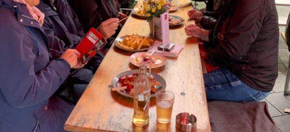 Leider war die Altstadt am Samstag bei diesem sehr guten Wetter überfüllt, so dass wir im Urigen keine Bierpause machen konnten, und im ersten Lokal die Schauspieler unter der Heinebüste kaum verstehen konnten. Die Tourbegleiterin sowie die Schauspieler haben dann sehr flexibel reagiert, ruhige Ecken aufgesucht, das Bier stattdessen im Lokal „Schlüssel“ ausgegeben und bei der Hitze eine Wasserpause in einem ruhigen Innenhof eingelegt. Die Lesungen aus „ Deutschland -ein Wintermärchen fanden dann zwischen den Gängen bei geschlosssenem Fenster statt, so dass alle die Heinerezitationen geniessen könnten. Alle Teilnehmer war mit dem Besuch hochzufrieden.
