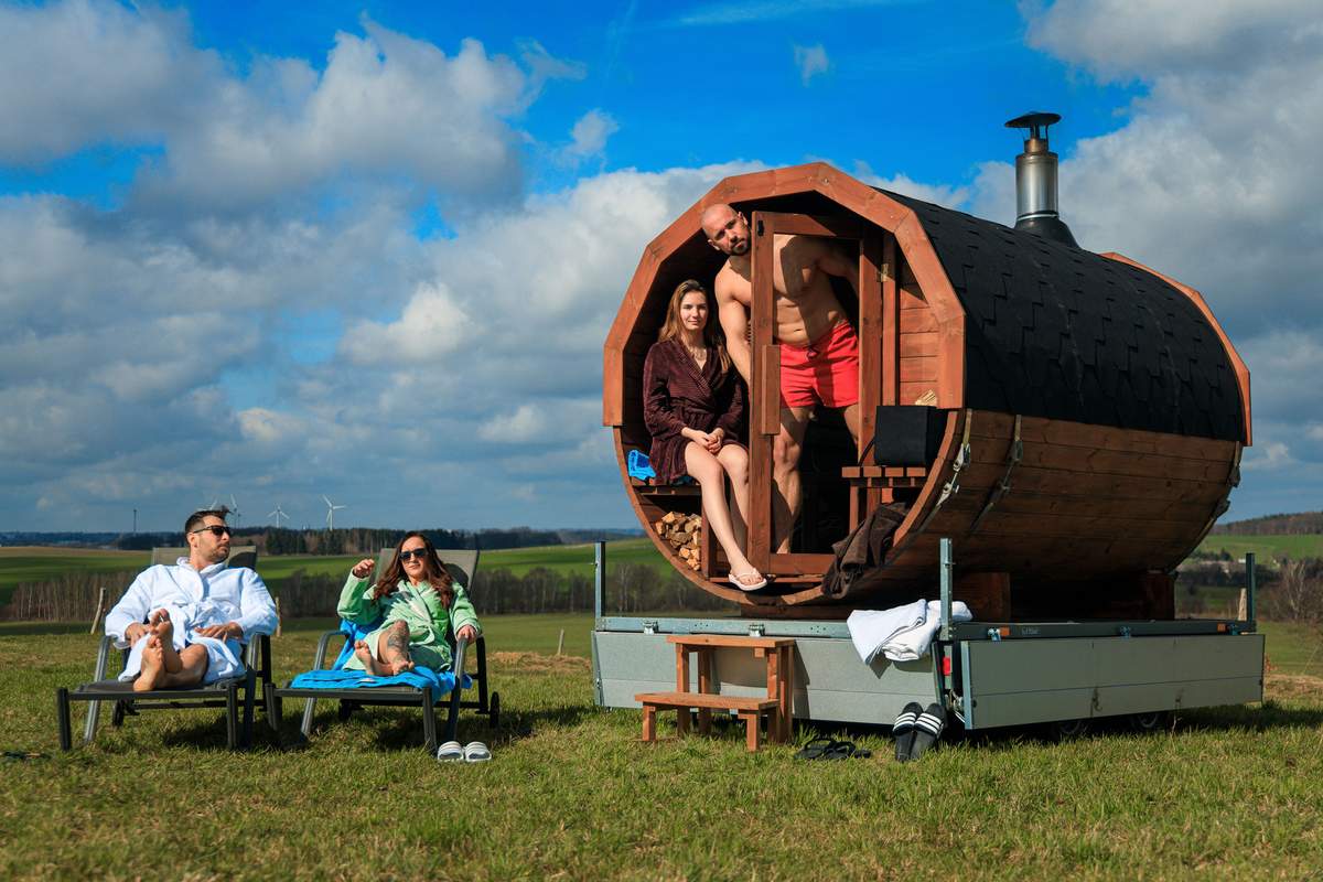 Mobile Fasssauna für entspannte Stunden im eigenen Garten – fertig aufgebaut, sofort einsatzbereit.