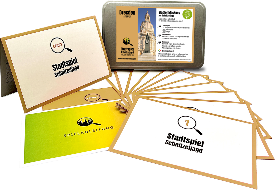 Darin befinden sich eine Spielanleitung, eine Startkarte, je nach Stadtgröße 11 oder 16 Spielkarten mit Wegbeschreibungen, kleinen Aufgaben und wissenswerten Fakten zu den Highlights am Wegesrand.