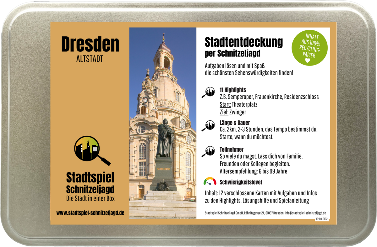 - Wetterfeste MetallboxInhalt: Spielanleitung, Startkarte, Aufgabenkarten inkl. Wegbeschreibungen, Aufgaben und wissenswerten Fakten, Lösungshilfe (die ihr hoffentlich nicht braucht)