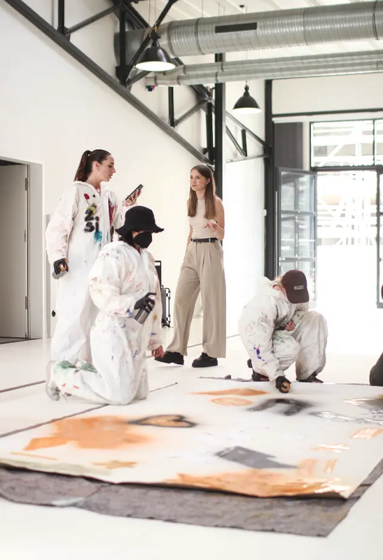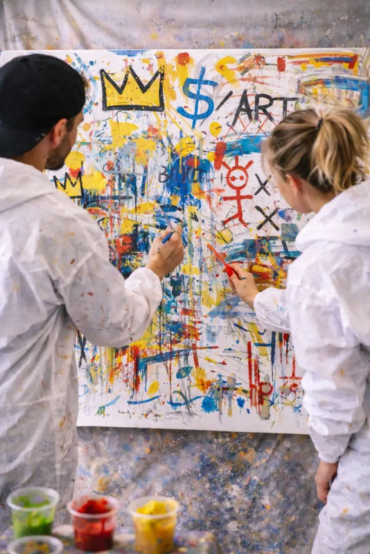Zu Beginn wählt die Gruppe einen vorbereiteten künstlerischen Ansatz, z. B. inspiriert von Jackson Pollock (dynamisch, rhythmisch, gestisch) oder Jean-Michel Basquiat (symbolisch, roh, intuitiv).