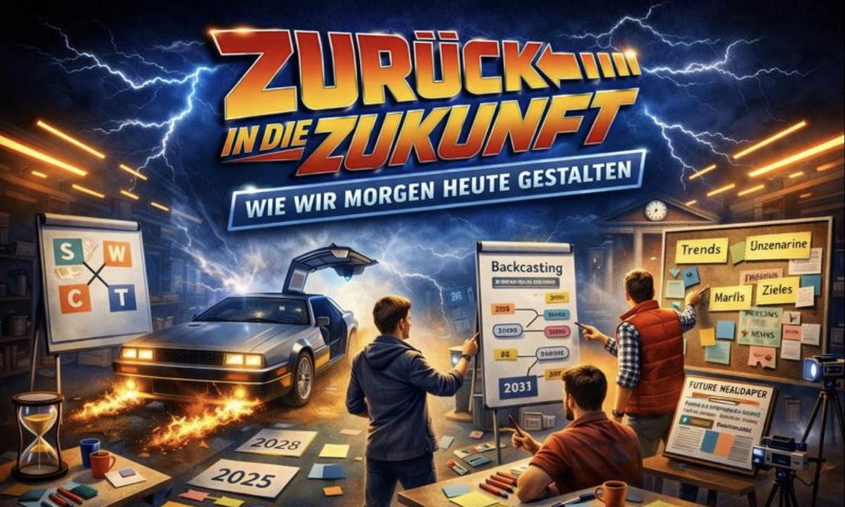 Der Workshop nutzt das bekannte Motiv „Zurück in die Zukunft“ als spielerischen Rahmen, um einen Perspektivwechsel zu ermöglichen. Die Teilnehmenden springen gedanklich nach vorne, schauen zurück, vergleichen Szenarien und leiten daraus konkrete Handlungen und Empfehlungen ab.